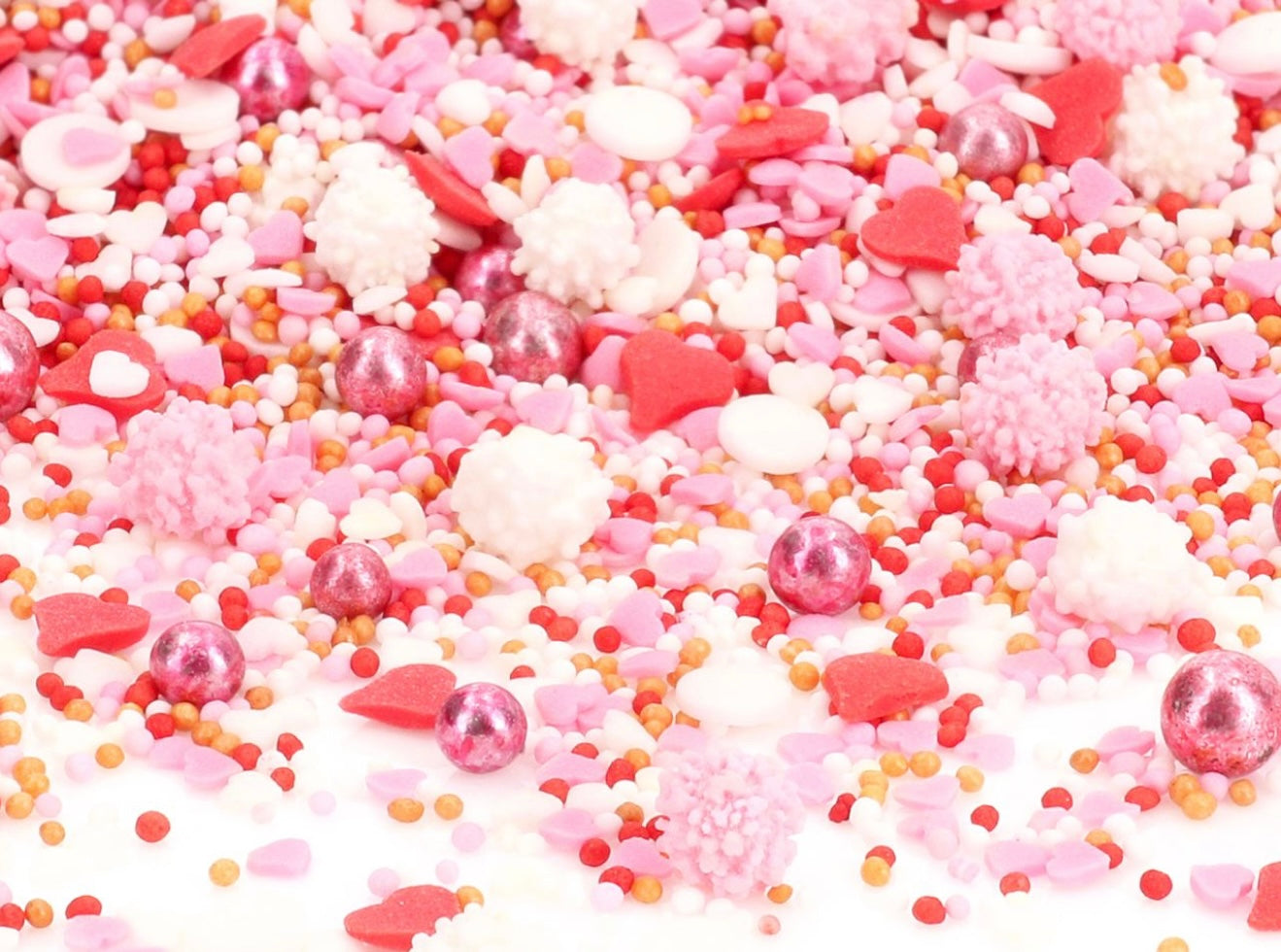 Dekorative Zuckerdekor-Mischung in den Farben Rosa, Weiß und Gold. Ideal für Gebäcke zu Hochzeit, Valentinstag, Mutterag uvm.