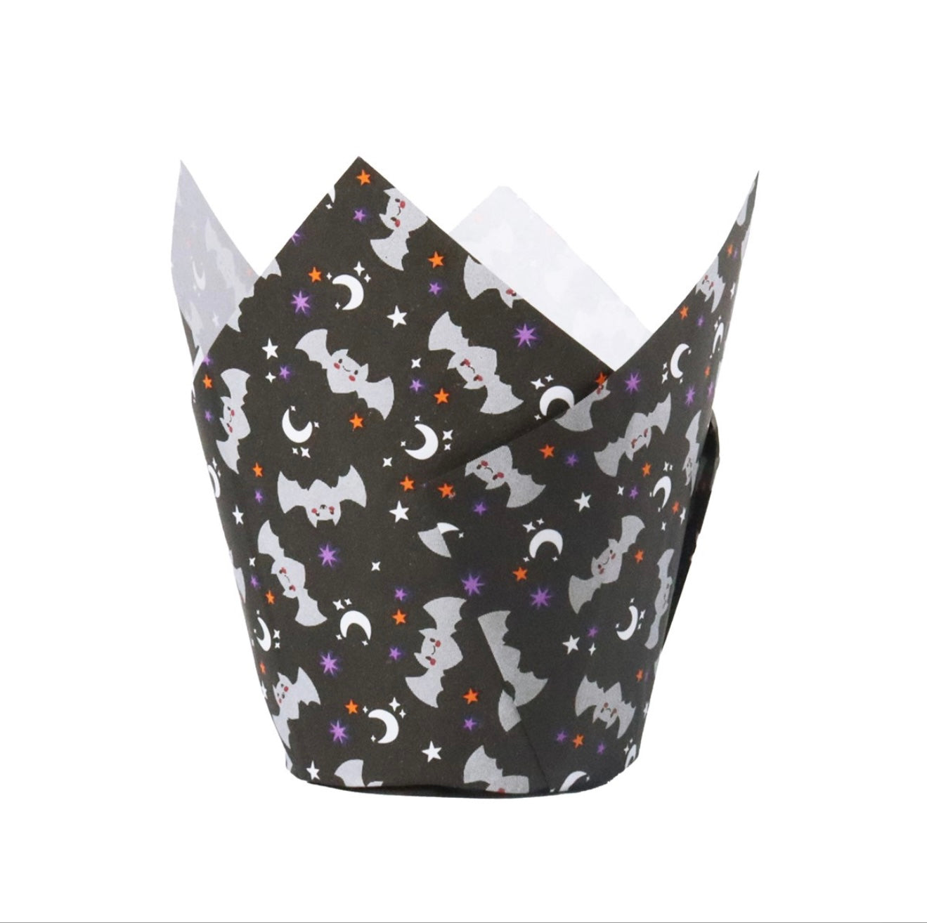 - Packung mit schwarzen & lila Förmchen mit Mond-, Stern-, Fledermaus- & Kürbisgesichtsmuster. Enthält 2 Designs x 12 Backförmchen jeder Art.